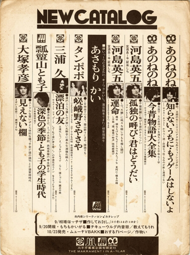 そのころ、吉田拓郎、諸口あきら、イルカ、笑福亭鶴光、そしてあのねのねのオールナイトニッポンを聞かなければ次ぎの日の高校でのクラスの話題の中へ入っていけないといった時代である。